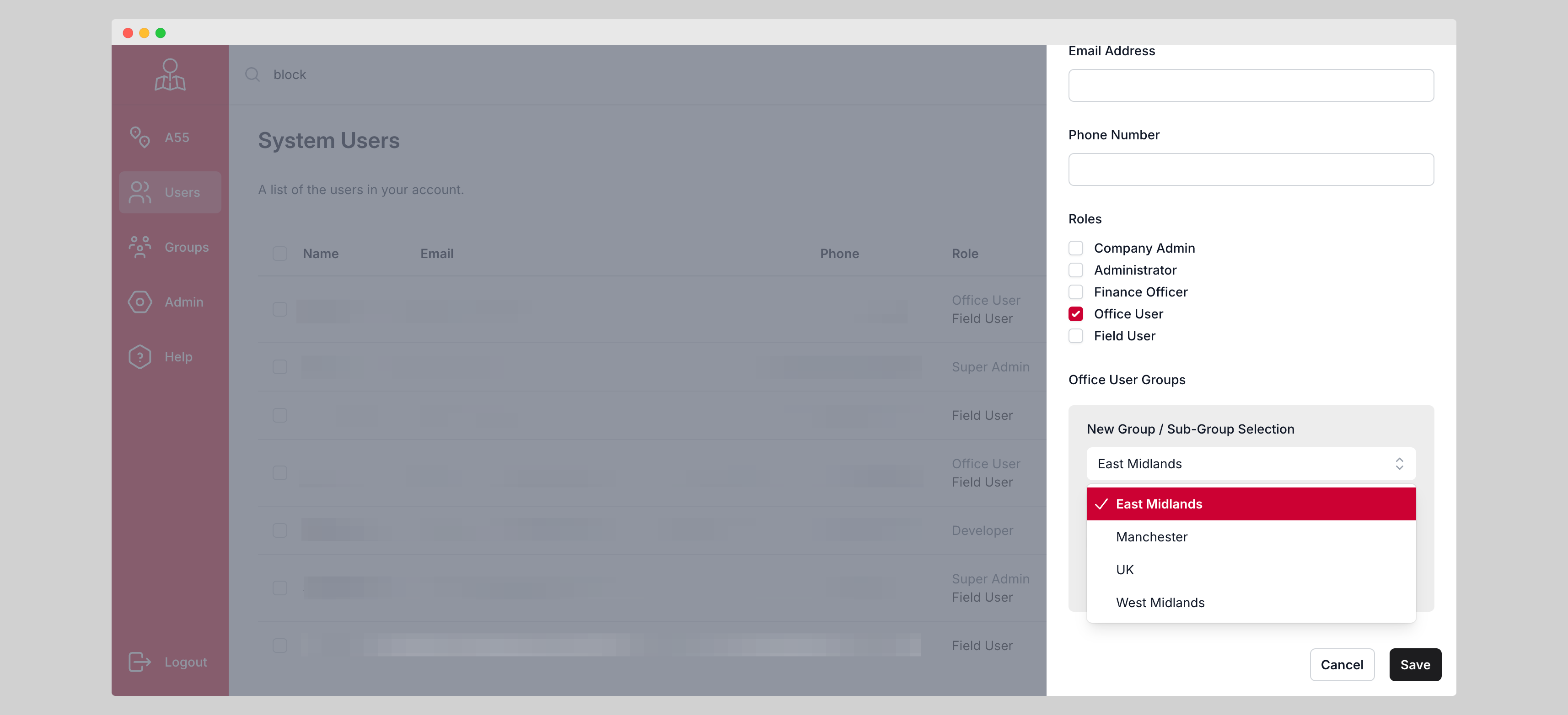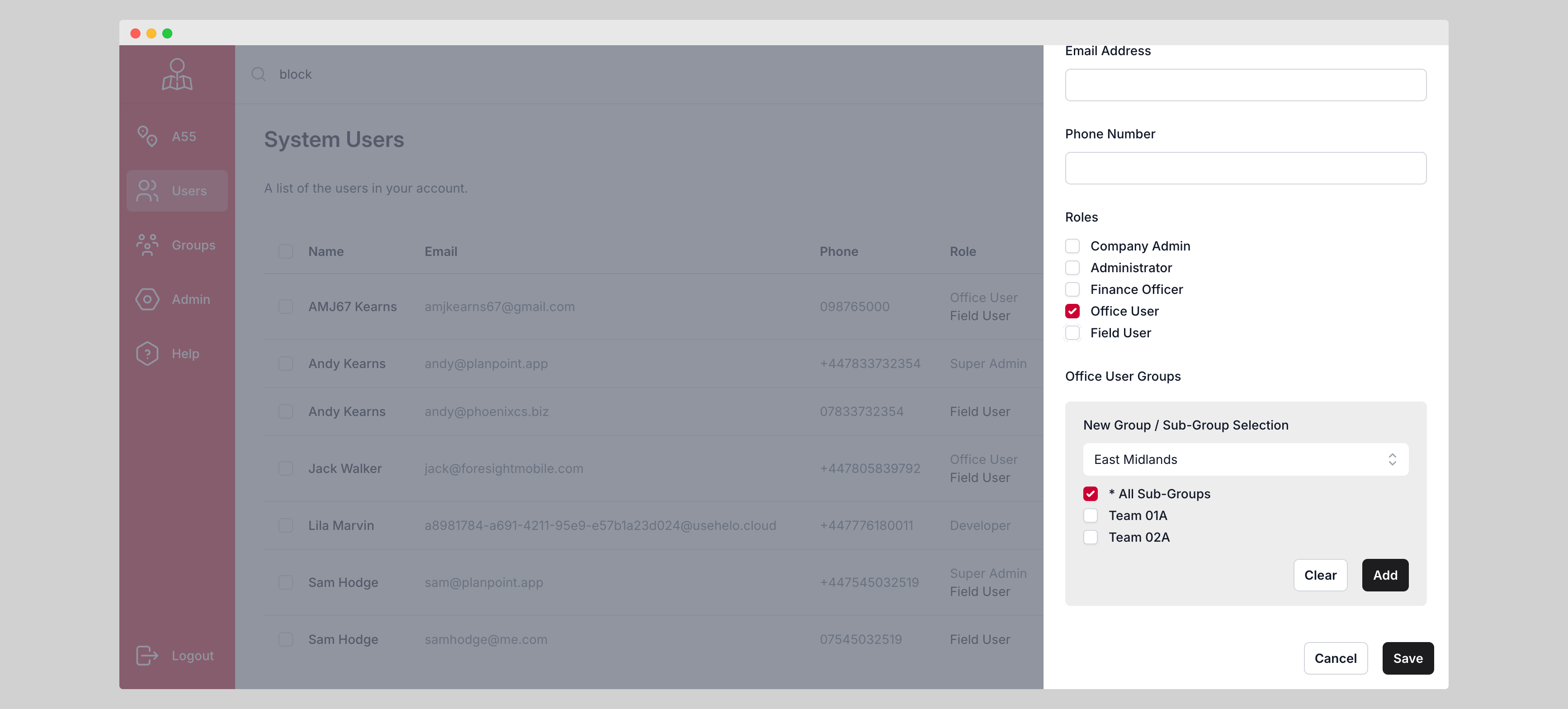 For example: This allows you to assign users to a particular team or subcontractor working within a region (Group).
